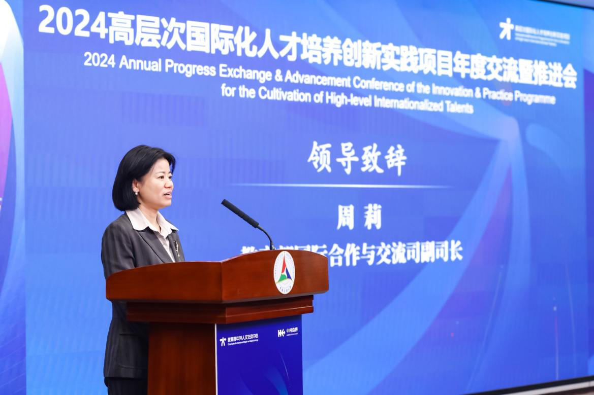周莉代表教育部国际合作与交流司对会议举办表示热烈祝贺。她指出,培养人才是国家和民族长远发展的大计,关于培养什么样的人才、怎样培养人才的重要论述,为深入推进高层次国际化人才培养工作指明了方向,提供了根本遵循。人文中心举办本次会议恰逢其时,有助于激发创新思维,推动相关工作向更高层次发展。未来,希望各方打造高水平交流平台,更好发挥教育国际交流合作在人才培养中的重要作用;聚焦国际化人才核心素养,培养满足国家和社会发展需求的国际化人才;集聚多元创新要素,以教育数字化赋能高层次国际化人才培养。