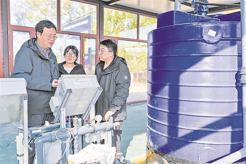 在肇东市五里明镇东升村,中国农业大学肇东实验站站长、教授陈永(左一)给学生讲解水肥一体化设备的操作系统。 新华社记者 谢剑飞摄