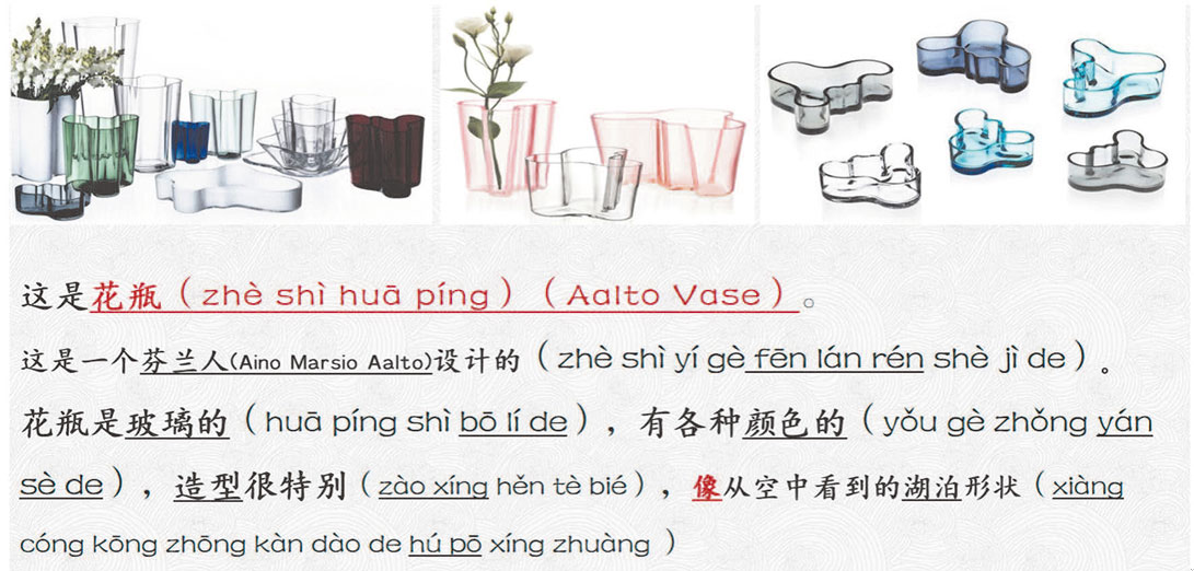 第二,人才培养体系与机制问题。新时代需要新的国际化人才培养机制,而我们现阶段对复合型国际化人才的培养目标尚不够明确,培养体系也不够健全,如何通过完善国际化人才培养体系与机制提高人才培养质量,成为新形势下亟待解决的问题。北京化工大学立足学校定位及学科特色,就如何更有效实施“中文+”进行了初步探索与尝试。怎样开设课程,采取什么样的教学手段,如何以地道的语言讲解专业知识,是学校目前着力攻关的重大课题。北京化工大学与意大利热那亚大学工业设计专业的本科双学位项目是学校与海外高校开展来华留学生联合培养的首个项目,新冠肺炎疫情影响下,来华留学生的学习受到影响,课程只能在线完成,包括综合汉语课。在完成了最基本的64学时的生活汉语后,意方提出希望采用workshop(工作坊)的形式进行第二学期32学时的“交际汉语”课程。这一提议给教学带来一大挑战,既要继续激发和延续学生的学习积极性,又要在课堂上让学生用有限的中文展开讨论。在通览所有教材后,教师自编教学材料并在合适的话题中融入专业词汇和内容。例如,在话题“谈学习”中,引入工业设计专业造型、材料等词汇,让学生通过描述某一产品设计进而交流完成教学(如下图)。实践证明,这一方式不仅提高了学生的学习兴趣,也扩充了其词汇量,包括课堂上未涉及到的专业词语的中文表达。因此笔者认为,探索更加有效的“中文+”教学方法,激发学生学习热情并满足未来工作需求,是一个值得研究的课题。
