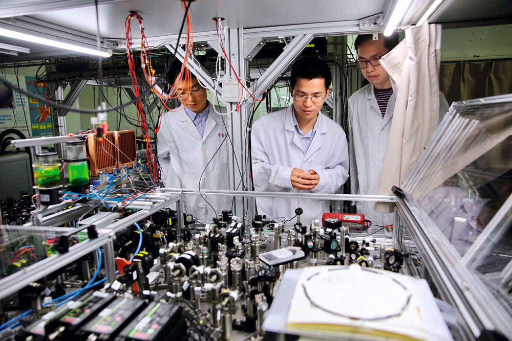 中国科技大学的“80后”教授陆朝阳28岁从剑桥大学博士毕业后回国投身量子领域前沿研究。图为陆朝阳(中)和学生们在检查光量子计算机的运行情况 摄影|新华社记者 金立旺
