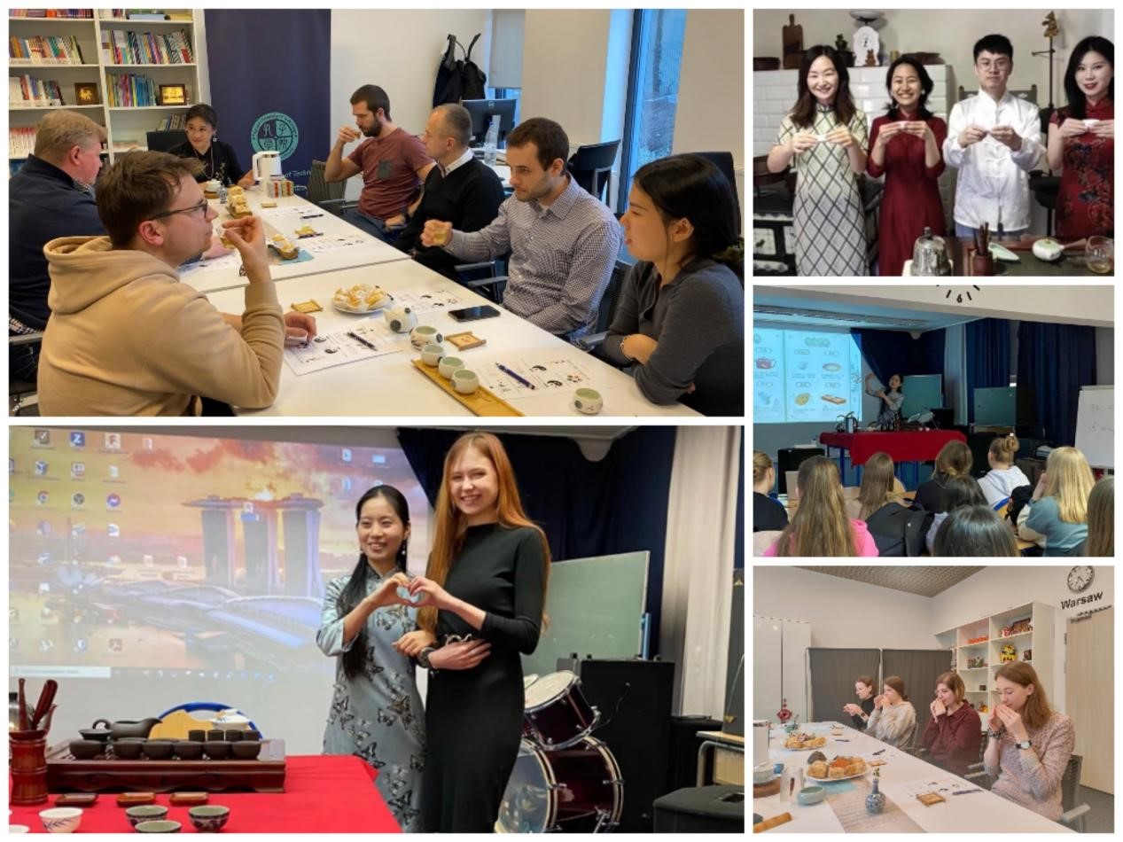 “水能洗铅华,茶可净心尘”,中国有着悠久的饮茶历史,作为中国传统文化的代表之一,茶道文化蕴含着中国人的优雅和淡泊情怀。华沙理工大学孔子学院举办“春日品茶”文化座谈会,中方院长讲解了“春”和“茶”两个主题汉字的甲骨文含义,阐释了茶与阴阳五行的关系,带领学生在米字格中规范地书写这两个汉字。活动现场,学生还就饮茶和泡茶问题进行了热烈讨论,品尝了绿茶和茉莉花茶等。4月20日,雅盖隆学院孔子课堂与波兰托伦市姜饼博物馆联合推出中华茶艺展示,中文教师和志愿者们合作录制了《中国茶艺》视频。奥波莱孔院也在当地中学的活动中加入了茶艺展示环节。