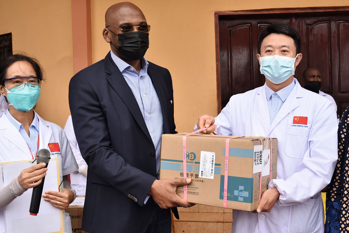 2021年8月12日-13日,中国(山西)第21批援喀麦隆医疗队在喀麦隆西部大区的邦冈德镇举行大型义诊活动。图为医疗队向邦冈德镇捐赠防疫物资 摄影|科普索(新华社发)