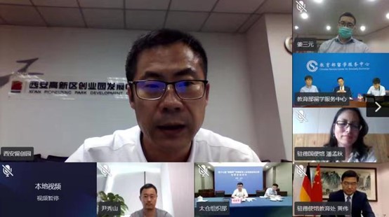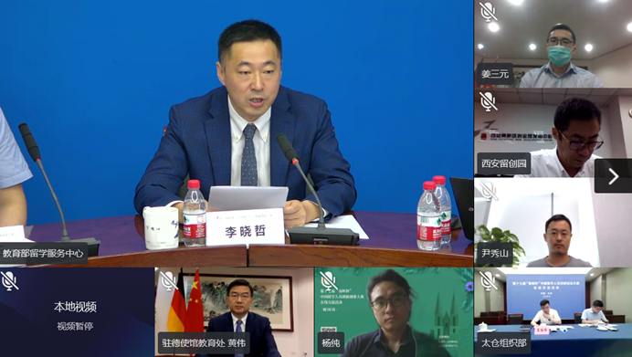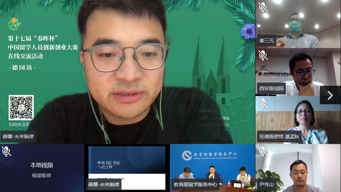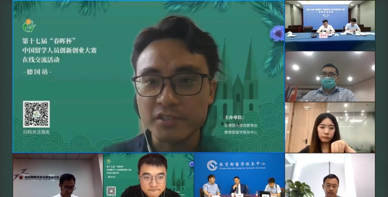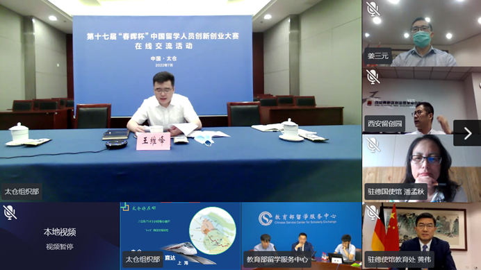 (神州学人网讯 记者惠娟 刘晓蕾)7月16日,由教育部留学服务中心(“春晖杯”大赛组委会办公室)联合驻德使馆教育处共同主办的第十七届“春晖杯”中国留学人员创新创业大赛(以下简称“春晖杯”大赛)德国分赛区在线交流活动举行。来自江苏太仓、陕西西安、上海浦东新区的相关负责人,以及多位往届“春晖杯”大赛德国分赛区入围项目代表,与广大在德学子在线交流,介绍国内创新创业环境政策,分享个人创业经验,共同助力在德留学人员的创业梦、报国梦。近7000名在德留学人员在线参与交流。