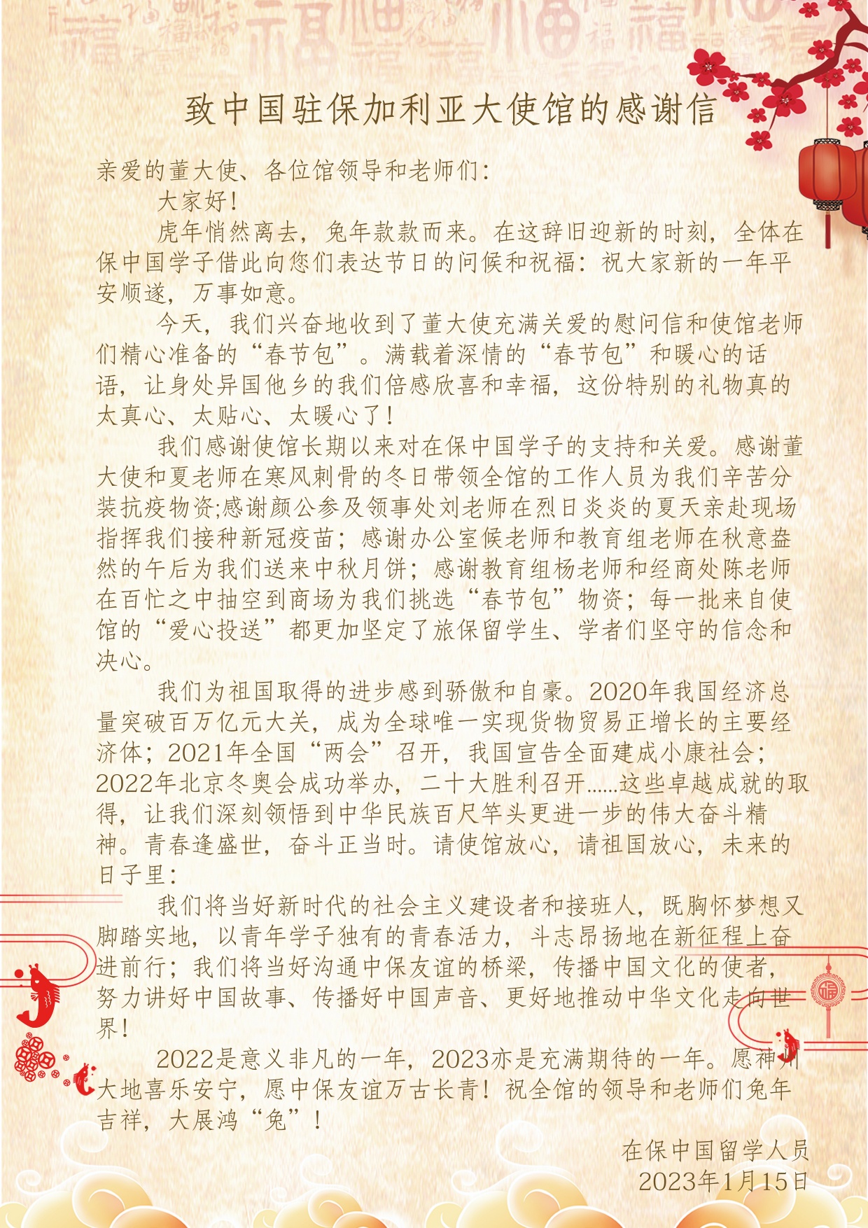收到“春节包”后,在保学子给驻保加利亚使馆写了一封感谢信。同学们在信中对使馆一直以来的支持和关心表达了由衷的感谢。大家表示,新的一年将以青年学子独有的青春活力,斗志昂扬地在新征程上奋进前行,当好沟通中保友谊的桥梁,传播中国文化的使者,努力讲好中国故事、传播好中国声音、更好地推动中华文化走向世界。
