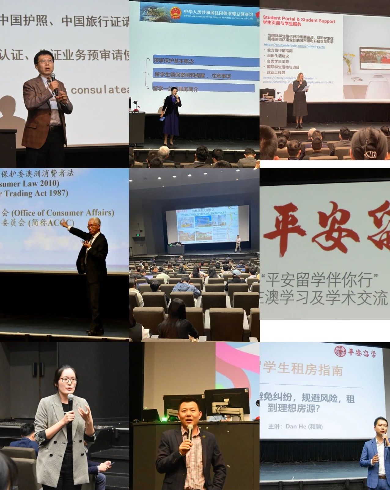驻阿德莱德总领馆领侨处主任李文斌介绍了领事证件办理知识,驻阿德莱德总领馆教育领事丁莉结合案例讲解了在外留学的注意事项、防范电信网络诈骗的应对要点。南澳州教育推广署国际市场总监凯特、南澳州公证律师萧嘉、弗林德斯大学教授唐友宏、阿德莱德城市全科医疗中心经理郑薇、Medibank南澳区域经理刘汉琦、澳达集团销售负责人和聃等从各自专业角度对留学人员的法律权益保护、学业规划、医疗健康、租房事宜等作出了针对性的讲解和提醒。