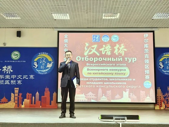 (神州学人网讯)4月26日至28日,由中国驻伊尔库茨克总领馆主办,俄罗斯伊尔库茨克国立大学承办的驻伊尔库茨克总领馆领区内大中小学生“汉语桥”中文比赛举行。驻伊尔库茨克总领馆副总领事孙传江、教育领事赵春露,伊尔库茨克国立大学校长施密特,伊尔库茨克州教育部高教处长尼古丽舍耶娃,伊尔库茨克国立大学孔子学院中外方院长张东辉、拜拉莫娃,以及领区内200余名大中小学师生代表参加了活动。当地青少年艺术团体及中国留学生代表联袂倾情演出,精彩纷呈。