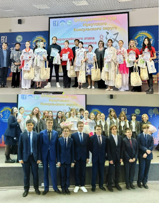 最终,来自布里亚特国立大学的叶尔吉科娃获得大学生组冠军,来自赤塔第四中学的基谢列娃、费达托夫获得中学生组冠军,来自伊尔库茨克第十九学校的拉里奥诺娃和乌兰乌德“HELLO”教育中心的杜布齐诺娃获得小学生组冠军。大学生组的前三名及中小学生组冠军将代表伊尔库茨克领区参加今年5月在伊尔库茨克市举办的全俄“汉语桥”比赛。