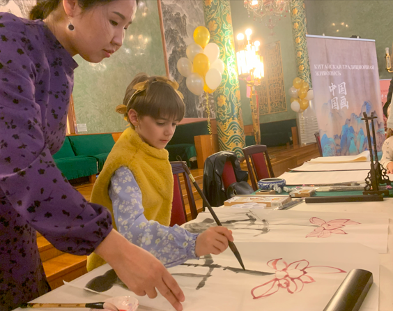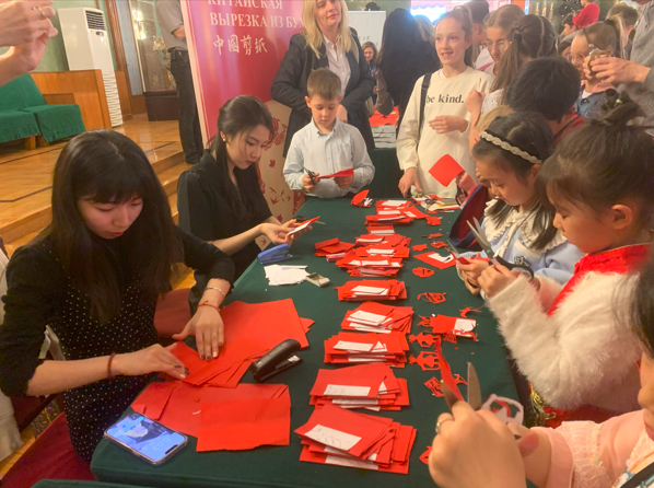 (神州学人网讯)6月2日,中国驻俄罗斯使馆举办六一儿童节招待会。莫斯科国立语言大学孔子学院在活动现场布展书法、国画、剪纸、雕版印刷、手工编织等5个中国传统文化项目,吸引中俄小朋友围观体验。