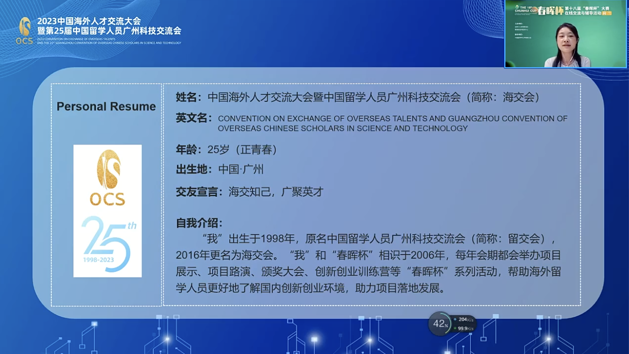 广州科研资源丰富,产业链完整,适宜创新创业。广州科技金融集团有限公司项目经理李思潼介绍了广州的创新创业环境和中国海外人才交流大会暨中国留学人员广州科技交流会(以下简称“海交会”)的具体情况。海交会自成立以来,通过论坛、展览、实地考察、人才招聘等系列活动,为国内需求单位和海外人才搭建了交流合作平台。她希望广大留学人员能够来海交会交流智慧、成就梦想。
