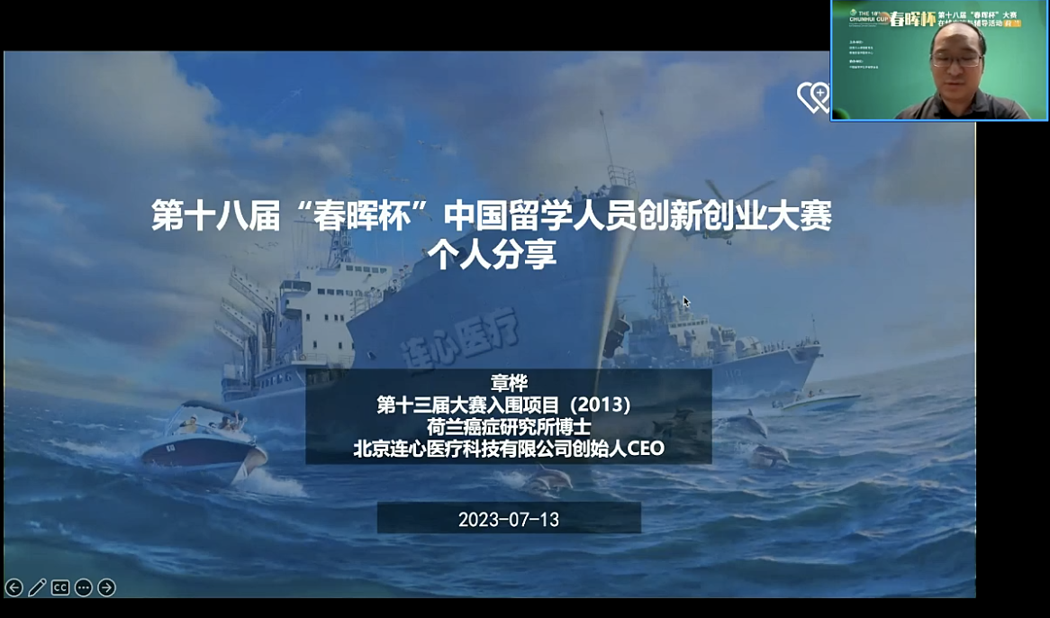 章桦是荷兰癌症研究所博士,他的项目曾成功入围第十三届“春晖杯”大赛,目前他是北京连心医疗科技有限公司创始人兼CEO。走过10年创业路,他和学弟学妹们分享了自己的创业经历。他说,创业过程中最重要的就是不忘初心、坚持梦想,希望大家能把所学专业知识和国家需求相结合,找准创业点,走稳创业路。