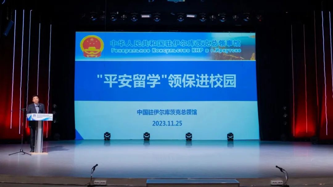 (神州学人网讯)11月25日,中国驻伊尔库茨克总领馆联合俄罗斯伊尔库茨克国立理工大学举办“平安留学——领保进校园”活动。总领馆双边处主任赵春露、领侨处主任窦晓兵、领事随员陈朝阳、伊尔库茨克国立理工大学国际学生事务中心主任康特里莫维奇出席,伊尔库茨克市6所高校近200名中国留学新生参加。