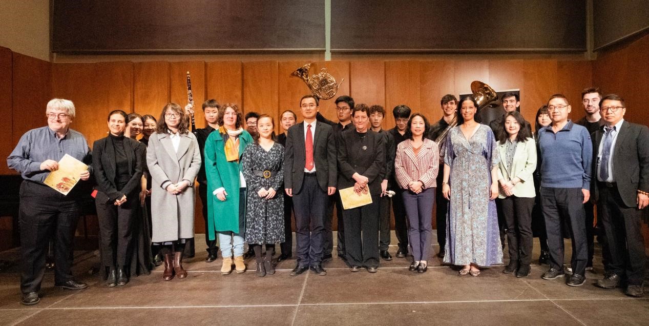 (神州学人网讯)1月31日,2024年龙年中国新春音乐会在利赛欧高等音乐学院举行。浙江音乐学院和广州星海音乐学院的学子给西班牙观众带来了一场具有中国韵味的音乐盛宴,驻巴塞罗那总领馆代总领事胡爱民参加活动。