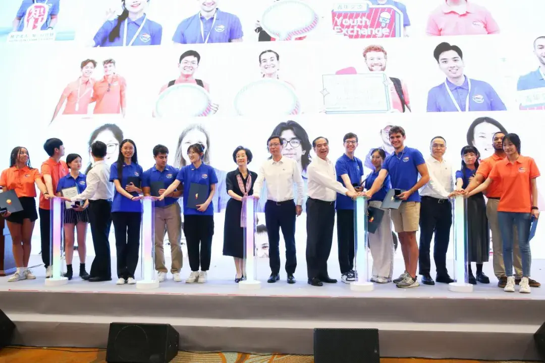 陈杰、龚旗煌、杨丹、杨军、袁明共同为12位中美学生代表颁发活动证书和徽章,见证同学们丰硕的研学成果。在仪式的高潮部分,嘉宾与学生代表共同启动了象征友谊与合作的灯柱,点亮的屏幕瞬间展现出中美青年学子的笑脸,这些笑容汇聚成了“YES”标志,将这一刻的青春与友谊永远定格。