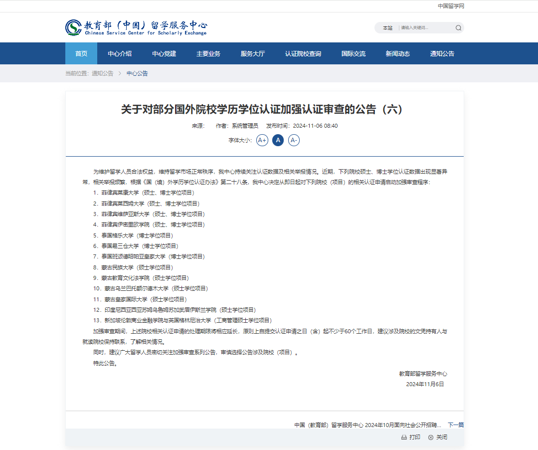 神州学人网讯 (通讯员 施惠文)据教育部留学服务中心(以下简称“留服中心”)11月6日消息,近期,下列院校硕士、博士学位认证数据出现显著异常,相关举报频繁,根据《国(境)外学历学位认证办法》第二十八条,留服中心决定从即日起对下列院校(项目)的相关认证申请启动加强审查程序: