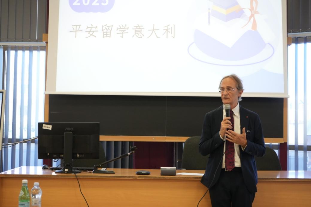 Giuseppe Ciccarone代表学校对驻意大利使馆的到访表示热烈欢迎,高度评价活动在加强学生安全教育、推动中意高校合作交流方面的重要意义,并表示学校将全力支持和保护中国留学生的合法权益,为中国学生创建更为安心、安全的学习环境。