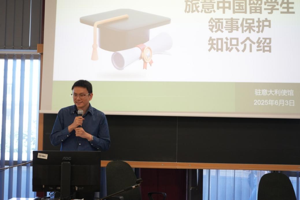 驻意大利使馆领侨处领事张虓以“留意学生领事保护知识介绍”为题,介绍使馆领事保护与协助工作基本情况与重要信息,结合多个真实案例,系统分析留学生常见安全风险,包括财物证件盗抢、电信网络诈骗等,提醒留学生坚持健康生活方式,远离“黄、赌、毒”和境外不法势力,增强自身风险防范意识和能力。