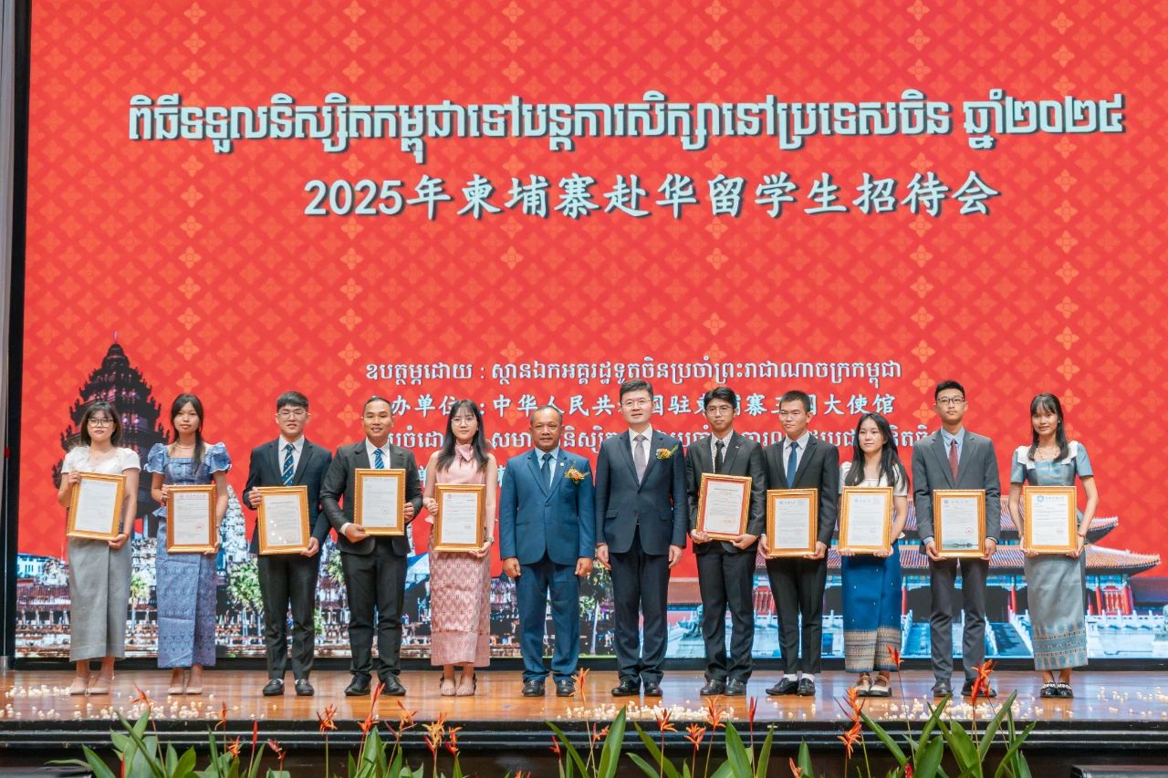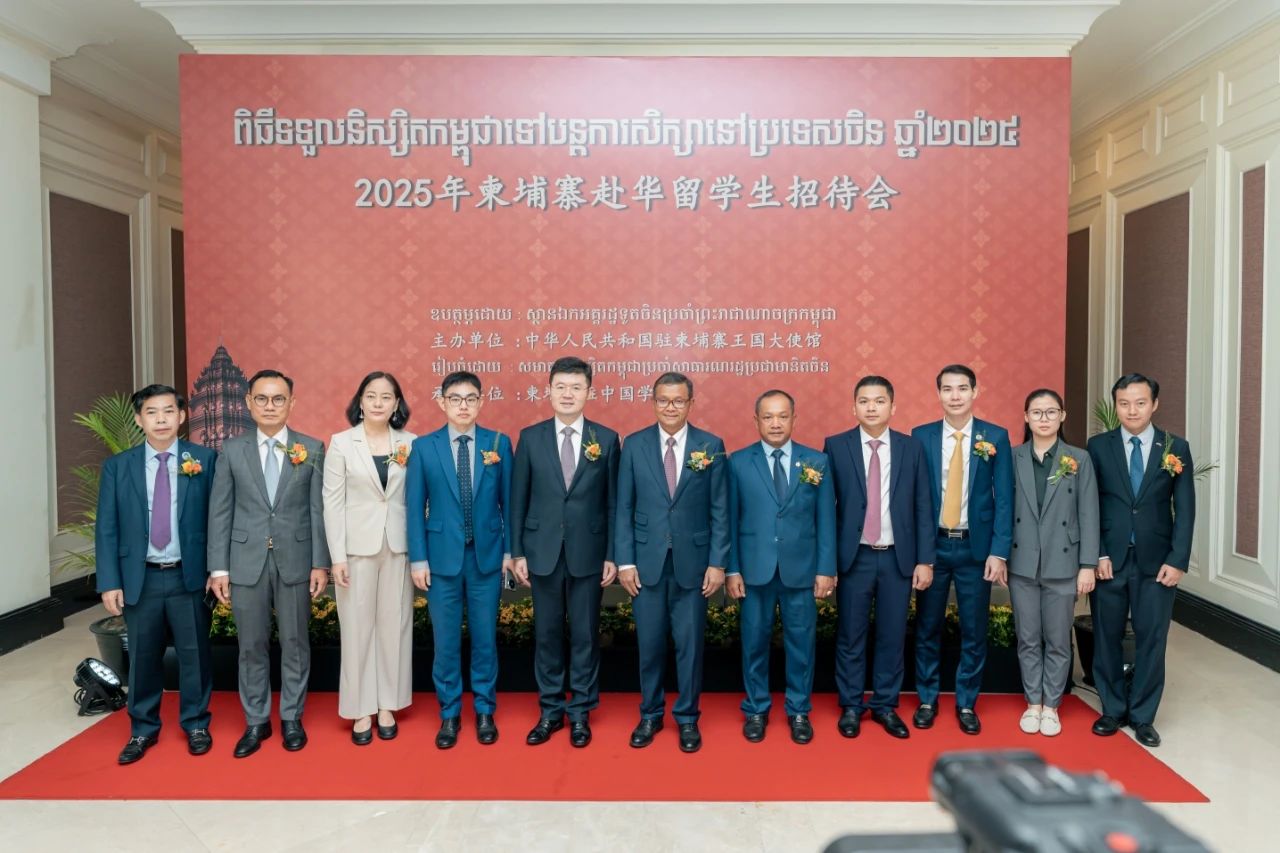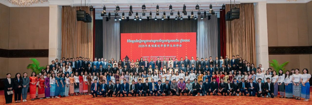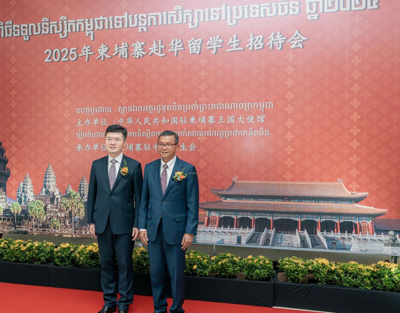 神州学人网讯 8月22日,中国驻柬埔寨使馆举办2025年柬埔寨赴华留学生招待会。中国驻柬使馆临时代办姜楠和柬埔寨副首相兼教育、青年、体育部大臣韩春那洛出席,2025年中国政府奖学金获得者、往届赴华留学生代表等约300人参加。