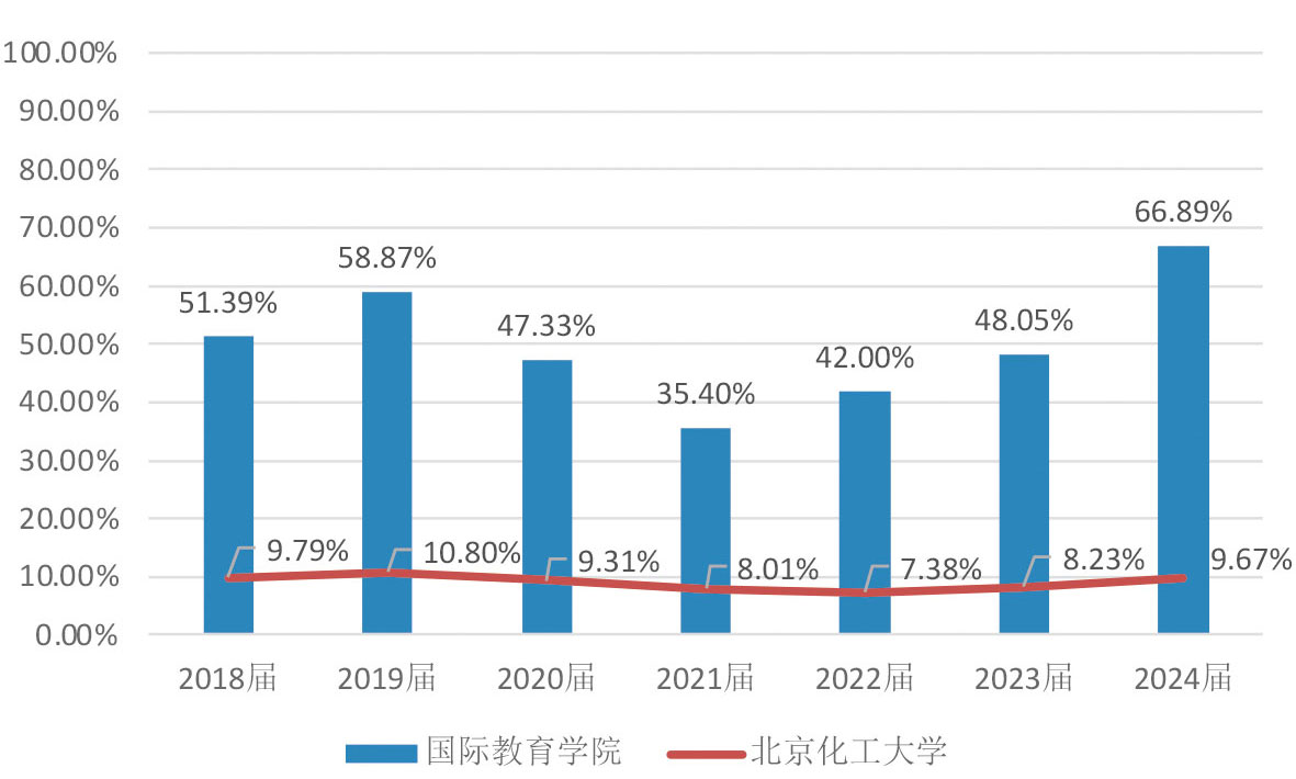 以北京化工大学国际教育学院本科合作办学项目为例,自2018年第一届学生毕业以来,7年间,项目毕业生境外深造比例达49.89%,远高于全校平均比例(9.03%),是学校境外深造比例最高的学院。