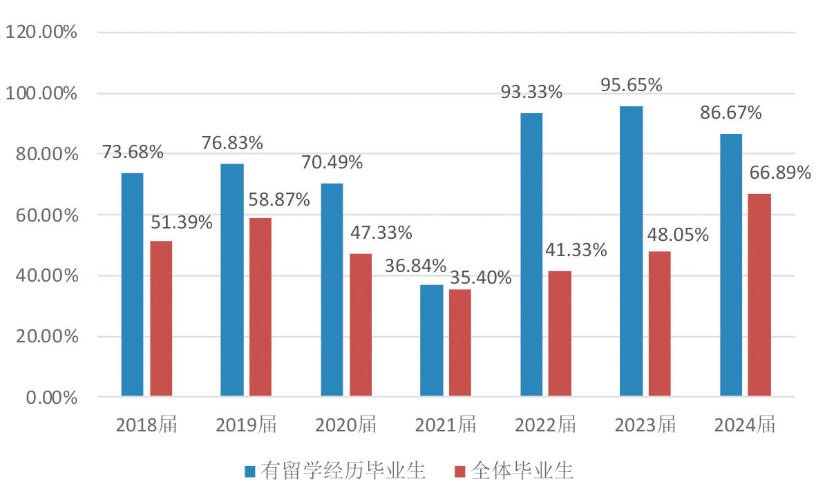 除2021届外,本科最后一年有出国留学经历的学生群体,境外深造平均比例为82.78%,远高于全部毕业生的平均境外深造比例(52.31%)。2021届学生因不可抗因素,最后一年是在国内以线上形式上课,境外深造比例与当届全体毕业生几近持平。