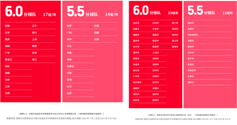 从区域来看,《报告》中对中国大陆地区各省、直辖市、自治区的学术类雅思考生成绩的分析描绘出“核心城市领跑、梯队划分清晰、区域差距逐步缩小”的图景,反映出不同地域教育资源、学习环境对雅思成绩的影响。