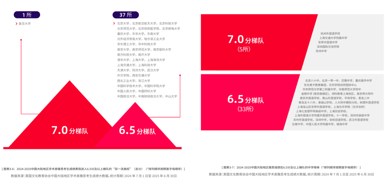 同时,在“双一流”高校中,有38所院校的学术类雅思总分平均分进入6.5分及以上梯队,相较去年新增3所。其中,复旦大学连续2年跻身7.0分梯队,独占鳌头。共有38所“英国文化教育协会雅思示范中学”进入6.5分及以上梯队。