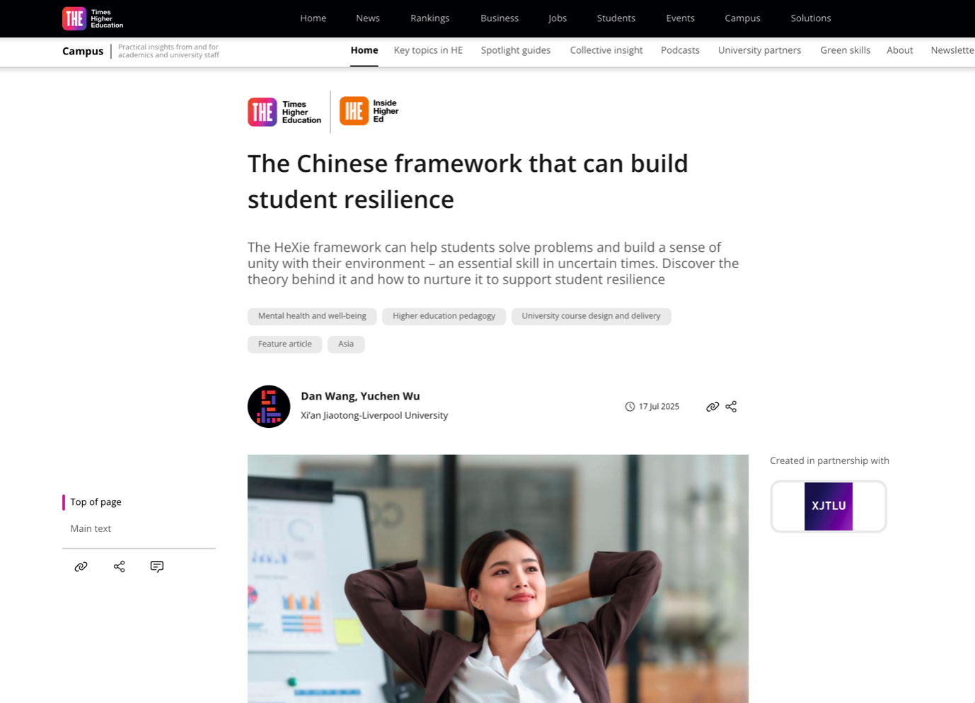 2025 年 7 月 17 日,西交利物浦大学产业企业家学院及和谐管理研究中心王丹与吴雨晨两位学者在泰晤士高等教育发表一篇关于 “和谐心智”(HeXie mindset)的文章