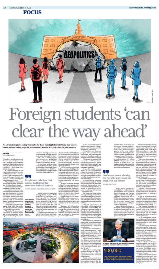 2025 年 8 月 9 日,南华早报刊发采访西交利物浦大学执行校长席酉民教授的报道