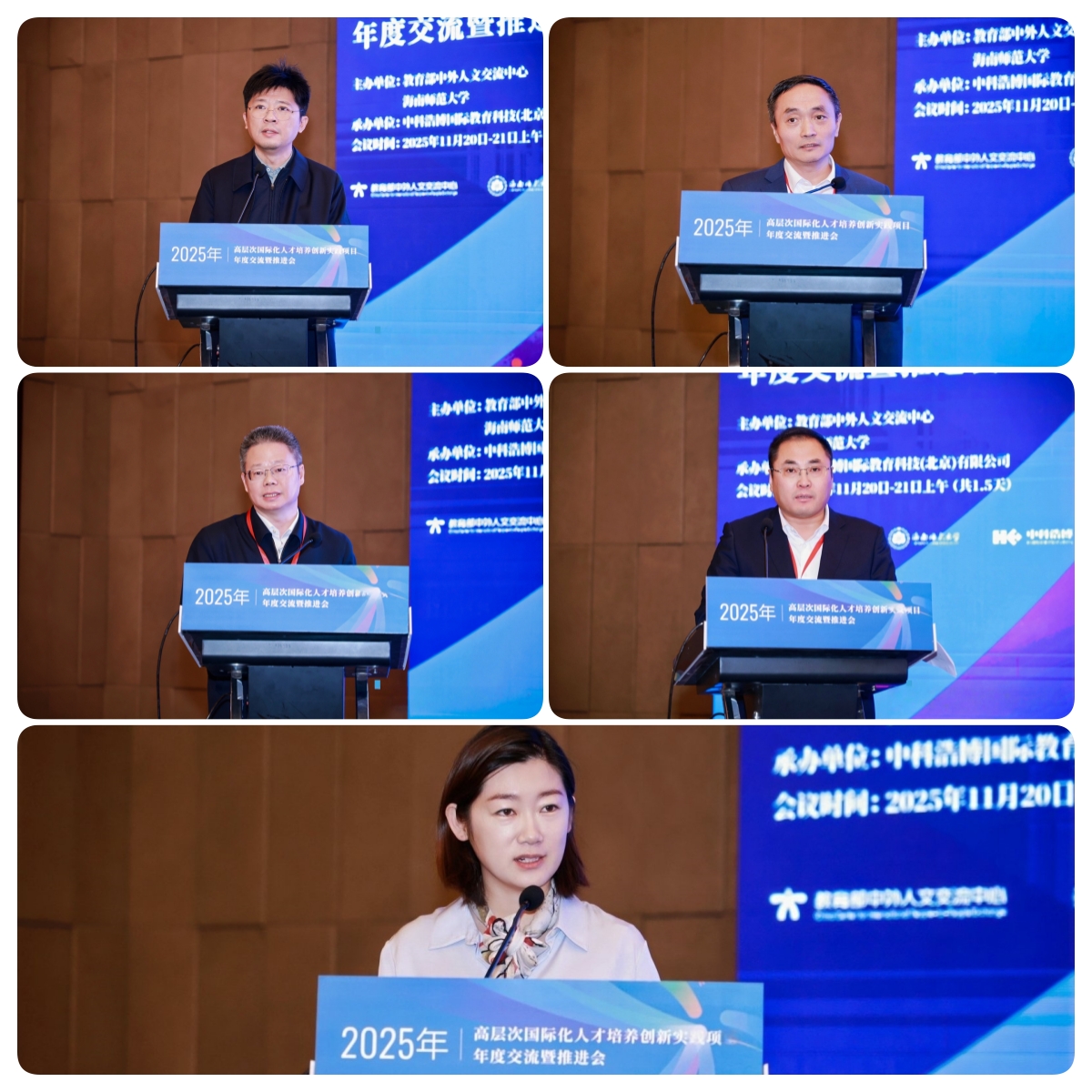神州学人网讯 11月20至21日,2025高层次国际化人才培养创新实践项目(以下简称“高层次项目”)年度交流暨推进会在海口举行。本次会议由教育部中外人文交流中心、海南师范大学联合主办,地方教育行政部门领导、高等院校领导及项目负责人、相关领域专家学者以及国际组织代表等86家单位180名嘉宾参会。会议通过专题报告、经验分享、圆桌研讨及专家指导等多形式,总结高层次项目年度成果,交流思想与经验,共商高层次国际化人才培养新路径。