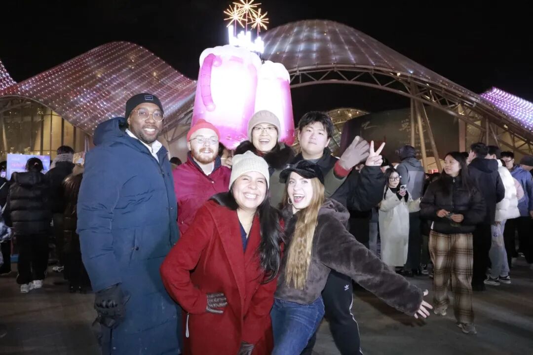 一场意外的邂逅,为文化体验增添了鲜明的时代注脚。2025年12月31日夜晚,学员们来到苏州狮山文化广场,恰逢Bilibili“跨年干杯夜”活动在此举行。古典园林的静谧与现代荧幕的炫动交织,传统江南韵味与年轻一代的潮流文化在此碰撞。当零点钟声在十城连线的欢呼与隔空“干杯”中敲响,美国学生学者们与无数中国年轻人一同,在璀璨的烟火与真诚的祝福中迎接2026年。