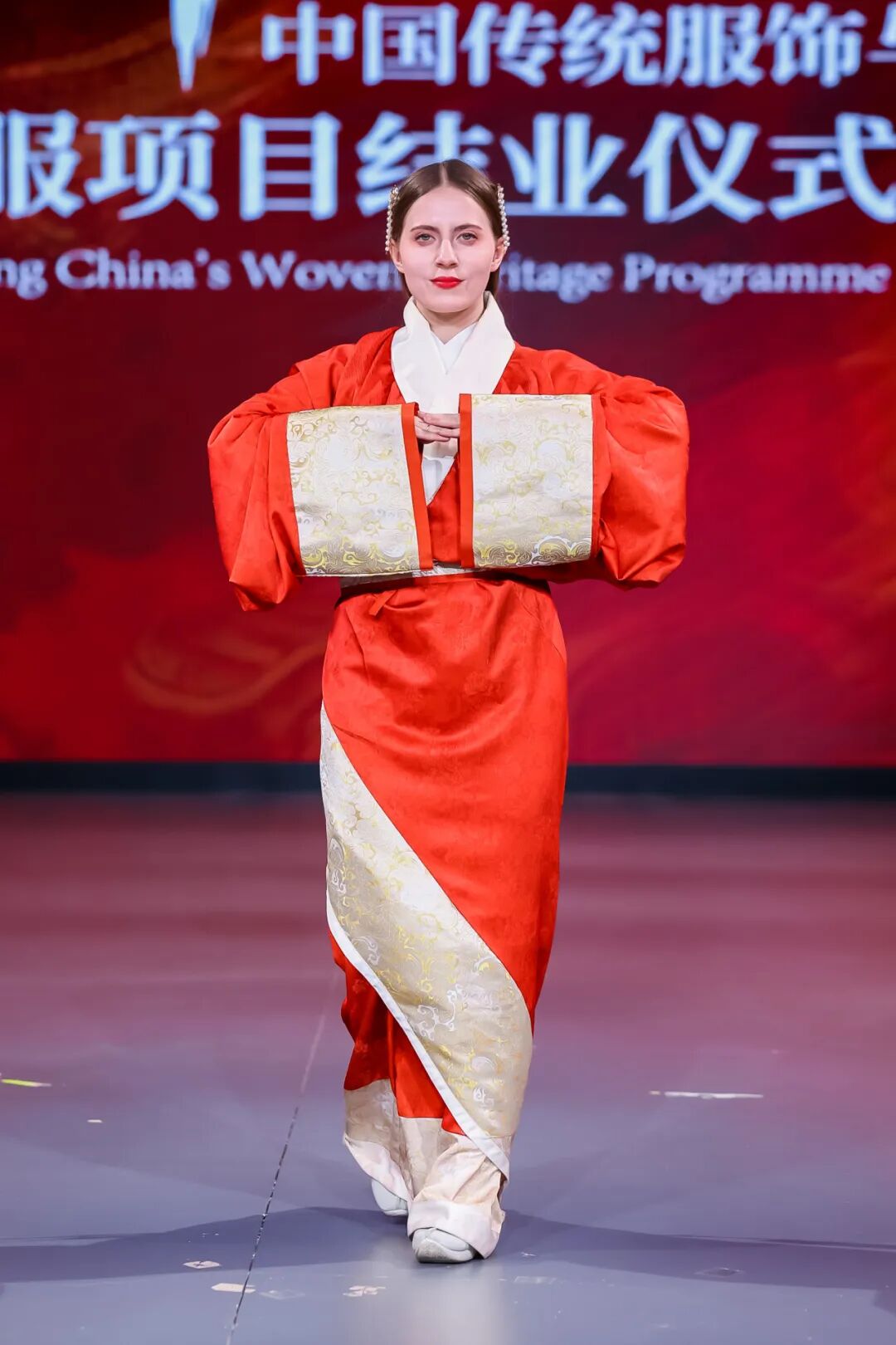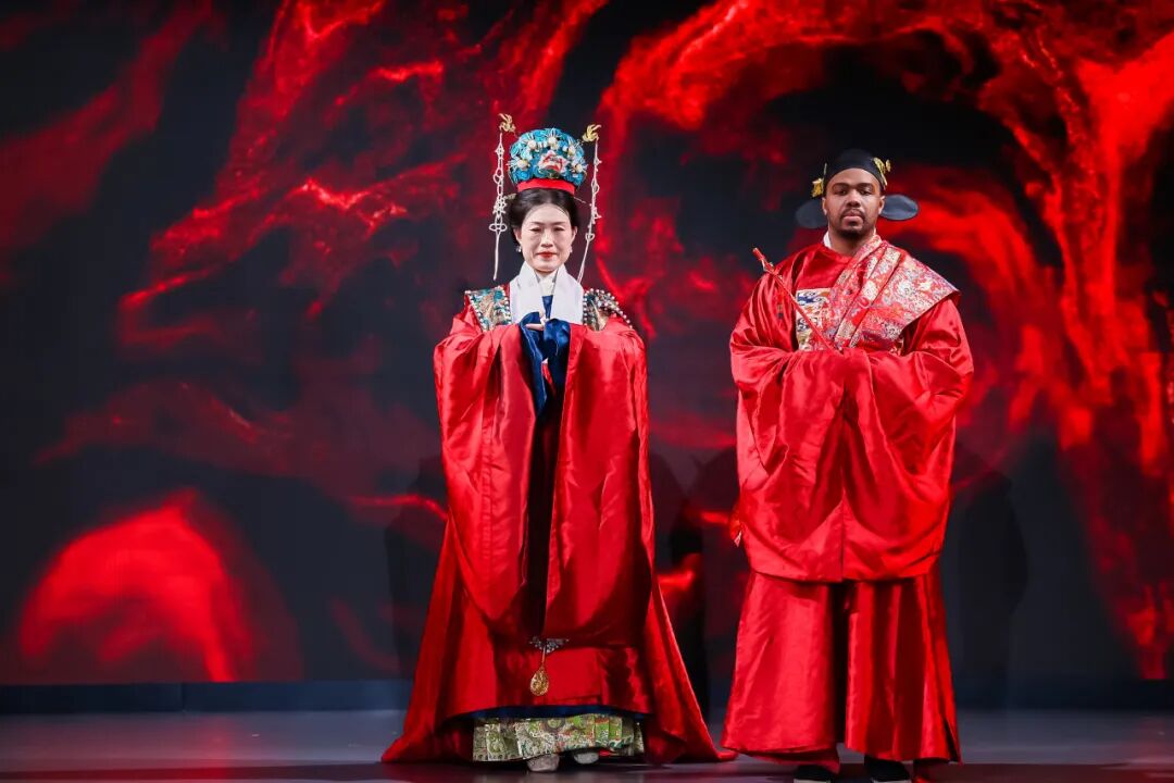 所有学习、体验与思考的结晶,最终在创作舞台上绚烂绽放。1月6日,“华夏衣冠·丝线中国”游学项目结业仪式暨展演活动在北京服装学院通州校区举行。北京服装学院副院长邹游教授出席并致辞,项目团队师生与学联代表共同见证。在专业教师的指导下,美国学者们将十日所学融会贯通,完成了一场沉浸式的中国传统服饰展演。从精致考究的妆发设计,到依据礼制与形制进行的服饰搭配,再到最终的舞台呈现,学员们不仅展示了外化的华服之美,更以内化的理解,诠释了服饰背后“衣冠载道”的礼制精神、“取法自然”的生态智慧与包容创新的东方美学。(图片/李宇星)