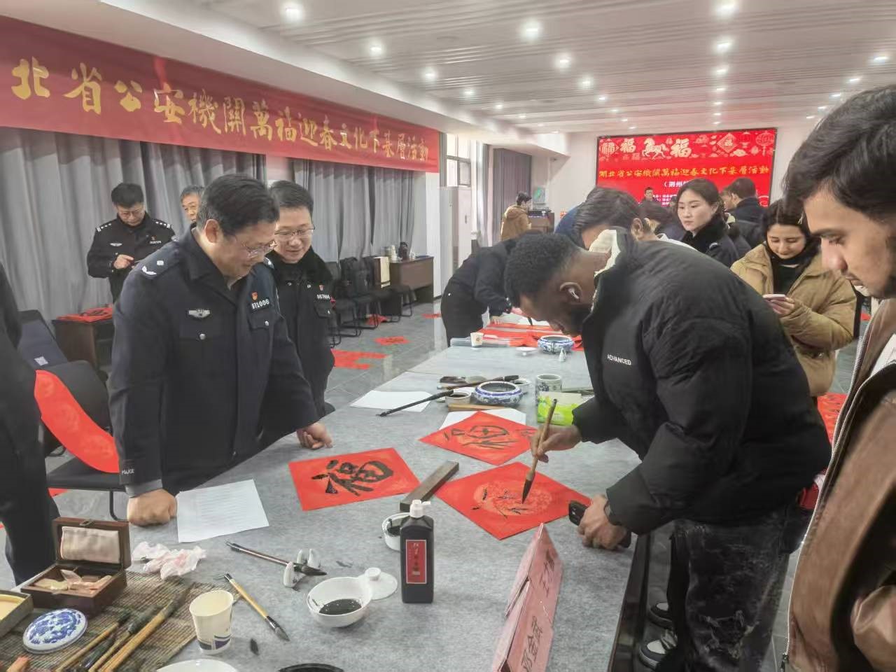 活动现场,墨香四溢、暖意融融。书法家们挥毫泼墨,一幅幅饱含新春祝福的春联、一个个遒劲有力的“福”字跃然纸上。来自巴基斯坦、也门、尼日利亚等国家的国际学生们兴致盎然地围观学习,有的提笔尝试书写“福”字,有的用母语写下新年祝福,还有的与民警们一起手持春联、福字合影留念。