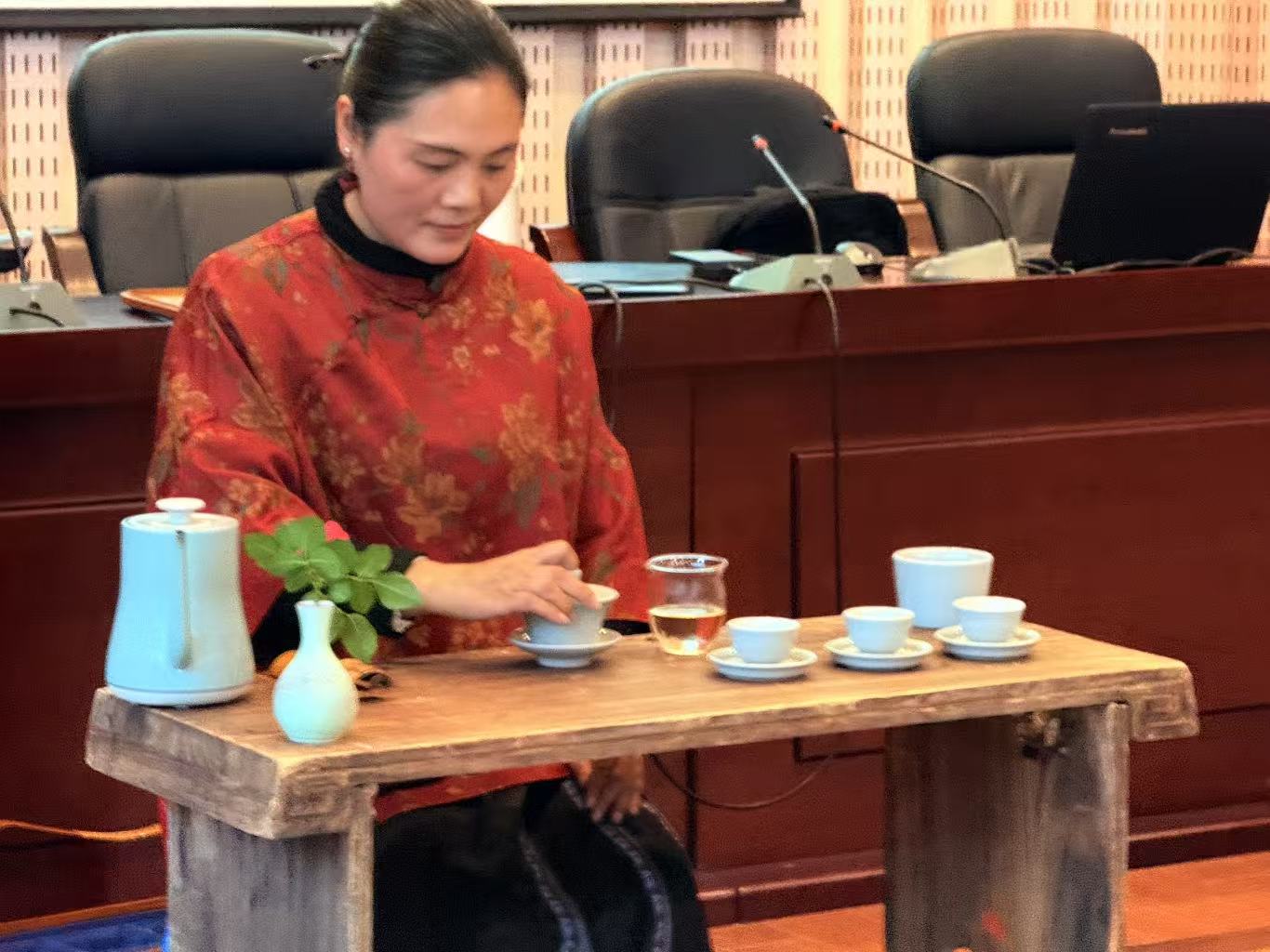 活动上,福建古琴专业委员会常务理事钟媛静坐琴前,轻抚慢捻,带领留学生沉浸在纯粹而古老的东方韵律之中。琴音余韵未绝,茶香已悄然弥漫。钟媛行云流水般地温杯、纳茶、注水、出汤,每一个动作都优雅如画,宁静如诗。