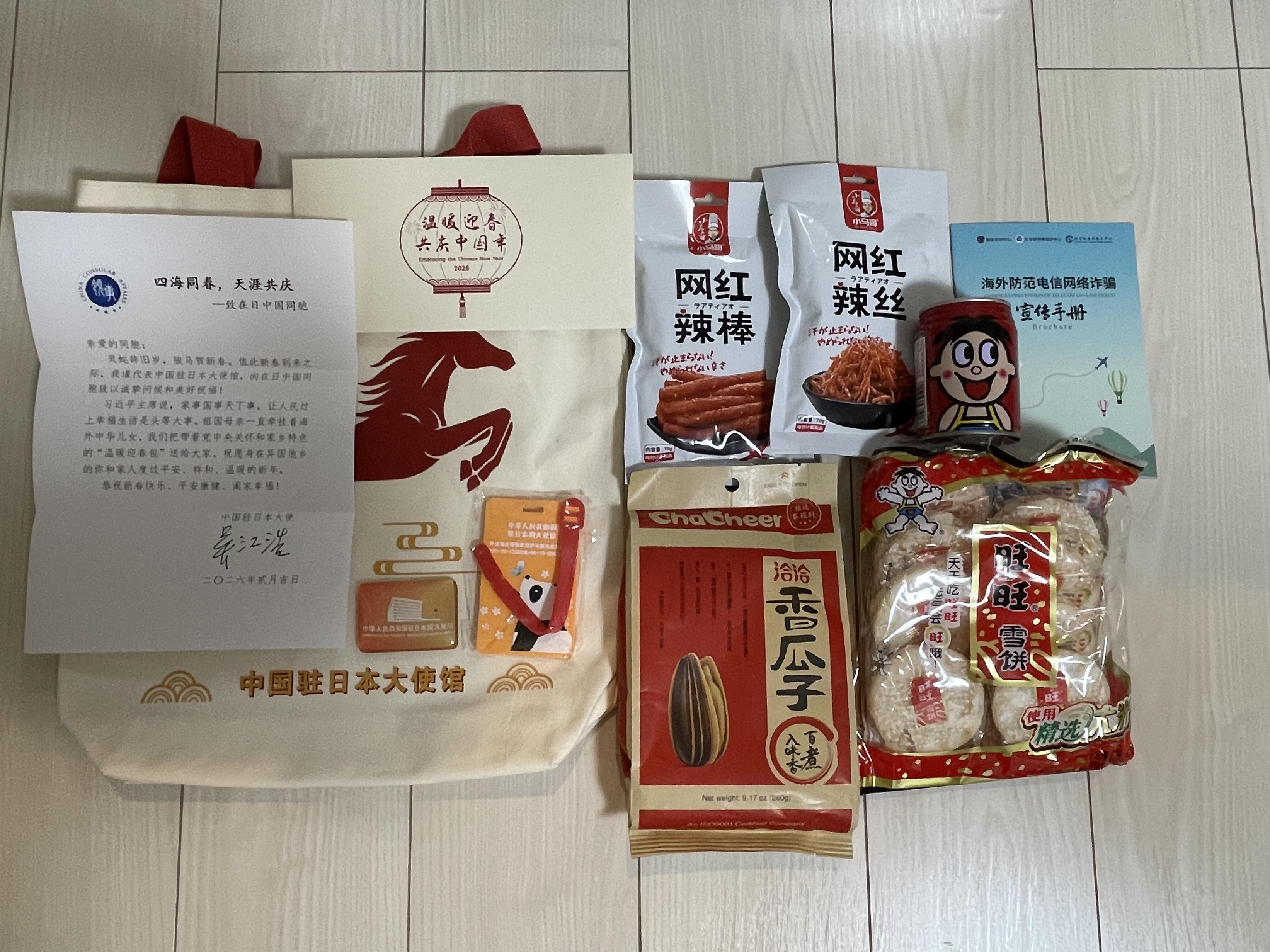 春节的前几天,我还收到了一份包裹。是中国驻日本大使馆发放的温暖迎春包。通过线上申领后寄到了家里,打开来,里面有驻日大使吴江浩的新春贺信、几样中国零食、一份文创小礼物,还有一个印着大红马的帆布袋。东西不算多,但拆开的那一刻,我心里突然有点酸。留学多年,早已习惯自己处理生活中的琐碎。可当这份带着春节两个字的包裹出现在门口时,我才意识到,原来真的有人记得我们身在海外的这一群人。贺信里祝福的话,没有太多修饰,却很真诚。那天晚上,我把零食分给同事们品尝,他们问我,这是中国过年特有的吗?我点头说是。说出口的那一刻,心里特别的踏实。