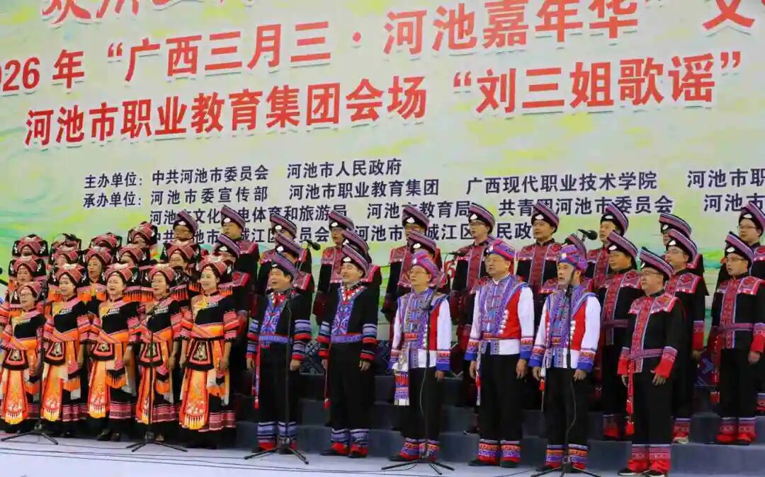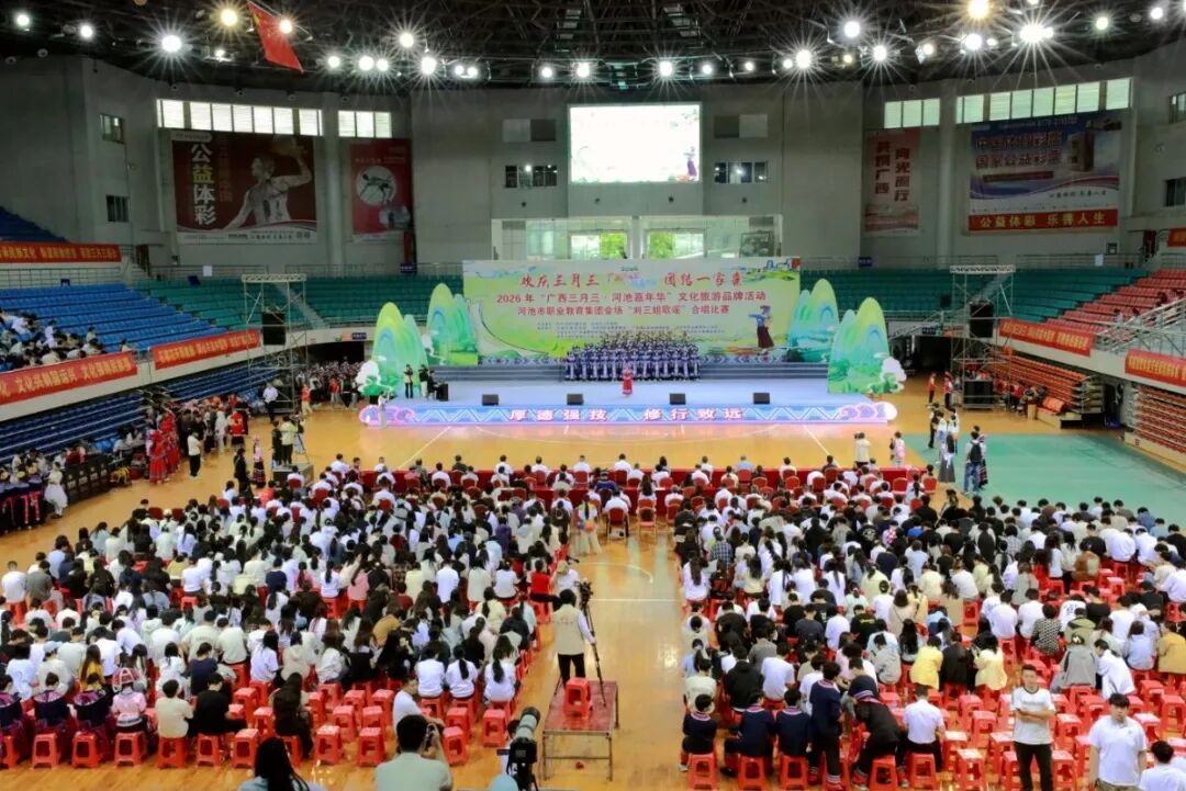 赛场上,歌声飞扬,精彩纷呈。河池市职业教育中心学校带来《广西尼的呀欢歌共唱同心圆》,明快节奏唱出各族儿女携手同心的美好愿景;宜州区职业教育中心演绎经典民族音乐剧《白莲盘歌》,婉转悠扬的旋律赢得阵阵掌声;广西河池民族农业学校的《春暖花三月三》,将春日生机与节日喜悦融入歌声,尽显青年学子的蓬勃朝气。