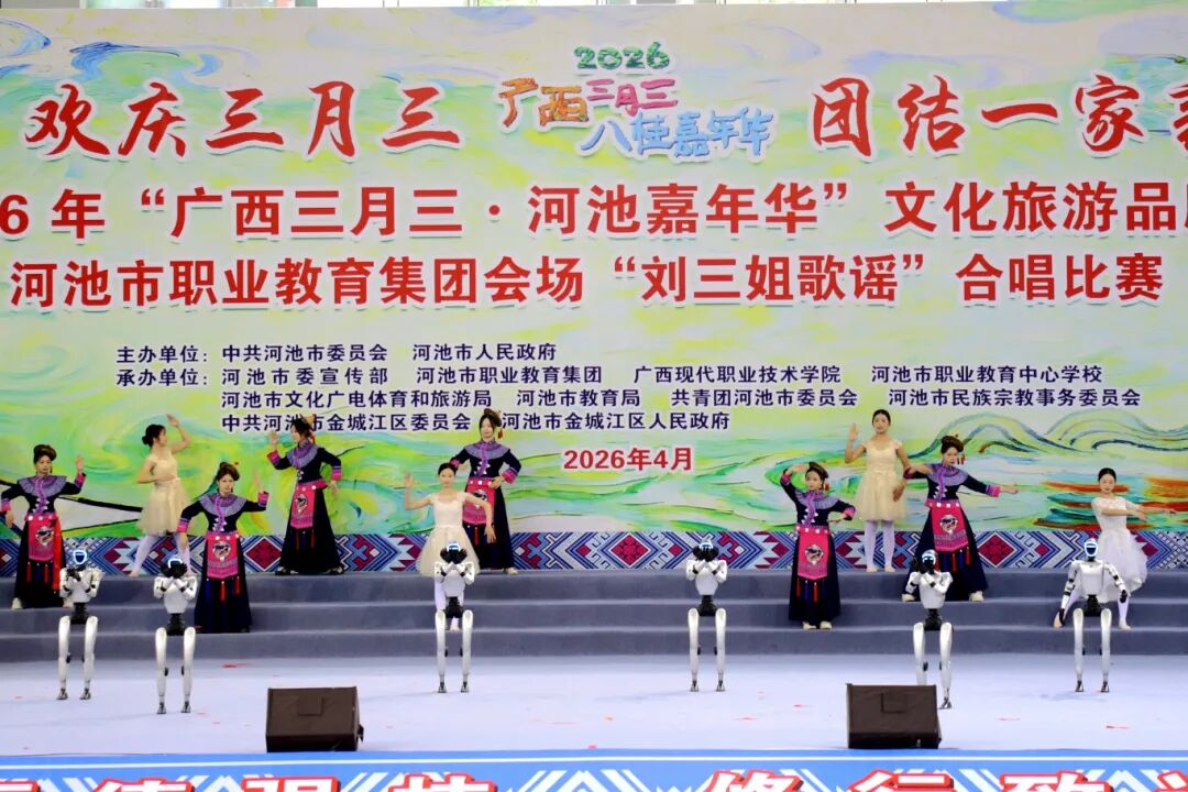 歌飞三月三,职教展风采。4月22日,2026年“广西三月三・河池嘉年华”文化旅游品牌活动——河池市职业教育集团主题系列活动成功举办。活动以“欢庆三月三团结一家亲”为主题,由中共河池市委员会、河池市人民政府主办,河池市委宣传部、河池市职业教育集团牵头,广西现代职业技术学院及河池市职业教育中心学校作为主场单位承办活动,联动河池市体育馆、校园厚德广场两大活动现场,串联刘三姐歌谣合唱比赛、民族体育体验、特色美食展示等多个环节,让古老歌谣与民俗风情在职业教育沃土上焕发新生。河池市政协副主席、广西现代职业技术学院党委书记韦伟松,广西现代职业技术学院党委副书记、校长黄绍光及相关单位、院校领导出席活动。