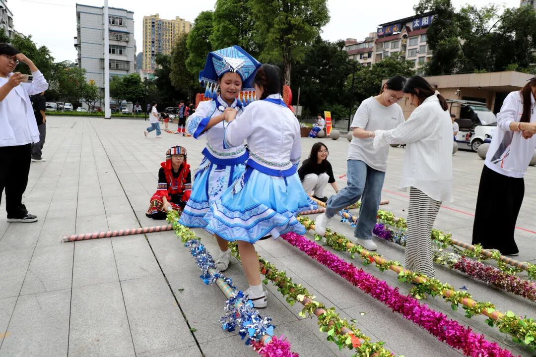 竹竿舞的清脆节奏声此起彼伏,身着民族服饰的师生们伴着音乐,在开合的竹竿间灵活跳跃,领导嘉宾也一同加入,在一合一张的节奏中感受民俗体育的乐趣,现场氛围轻松活泼。
