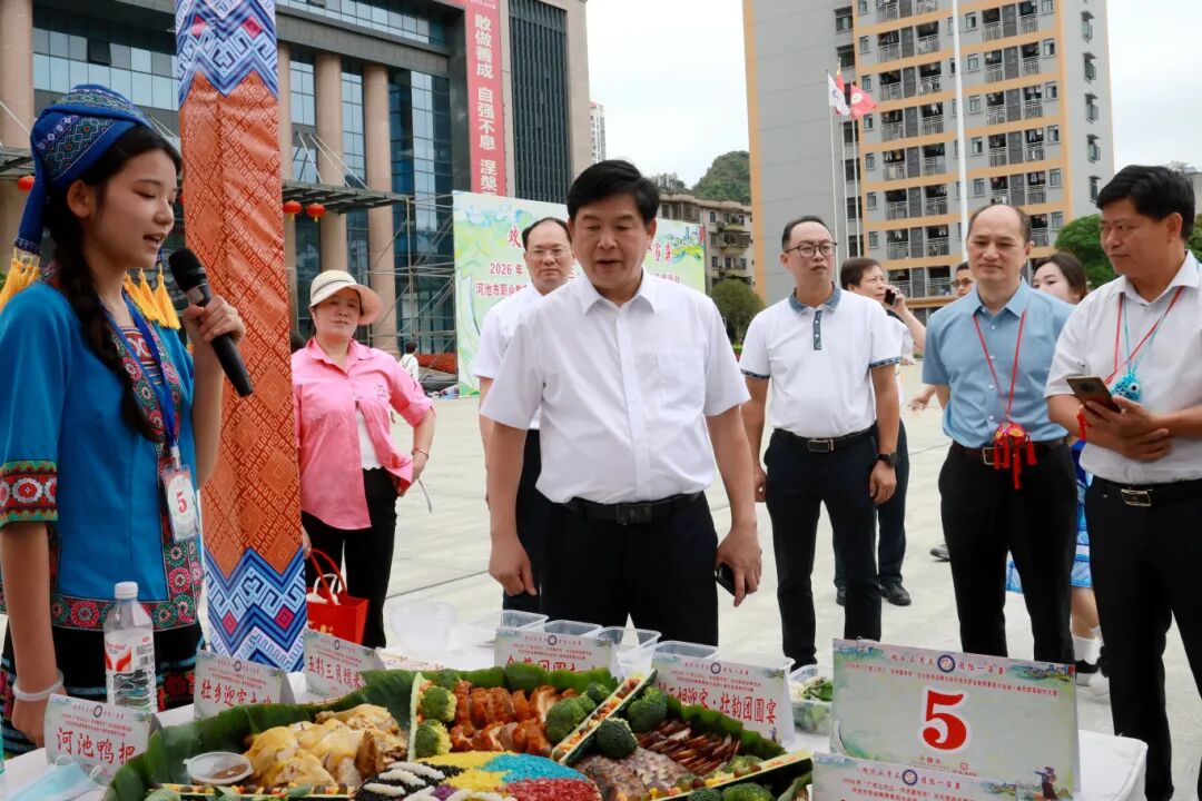 美食展区香气四溢、琳琅满目,各职教集团成员院校结合专业特色,精心打造特色展位,集中展示五色糯米饭、壮家龙崩、艾叶糍粑、地方酸嘢、寿源粽等河池本土风味美食。观摩嘉宾边走边看、驻足品鉴,充分肯定师生以技能赋能民族文化传承的实践做法。