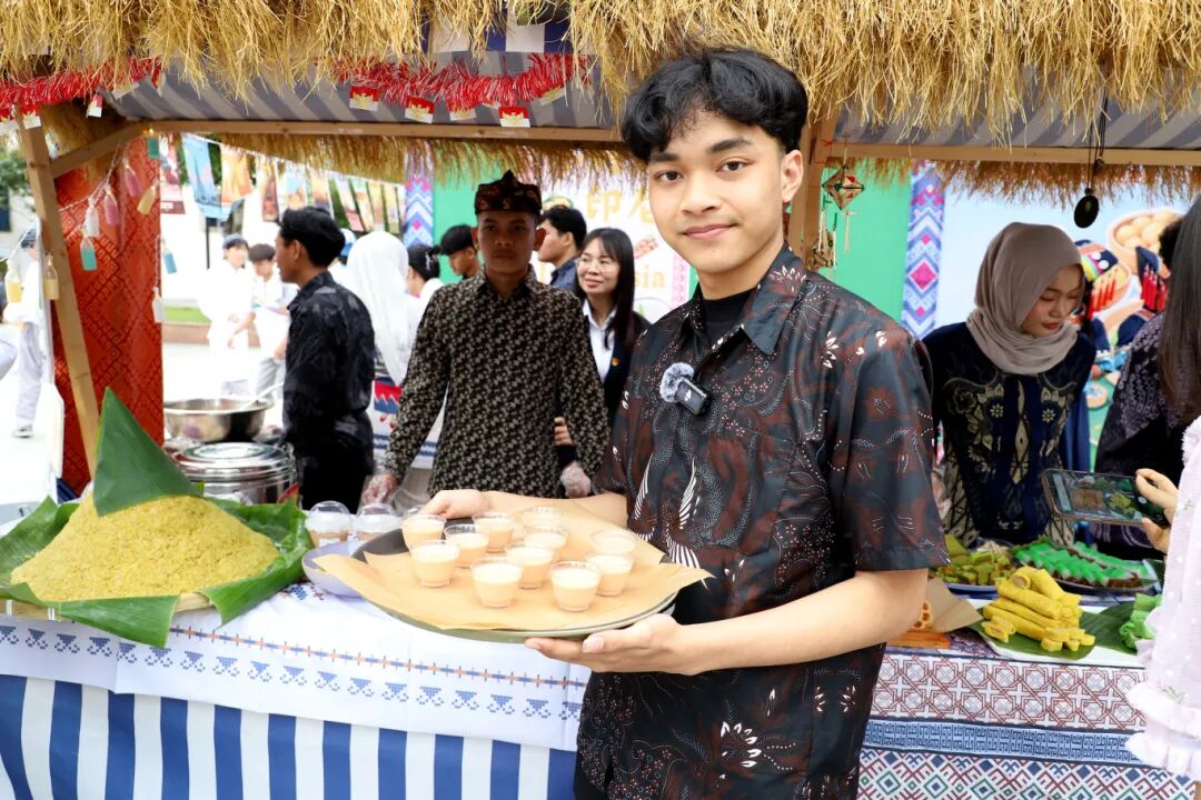印尼留学生特色展位格外亮眼,留学生现场制作异国风味小吃,倾情唱响经典广西山歌《多谢了》,婉转歌声收获阵阵喝彩。留学生们还表演了他们家乡的传统舞蹈,让师生在美食与歌声的交融中,增进了文化交流与友谊。