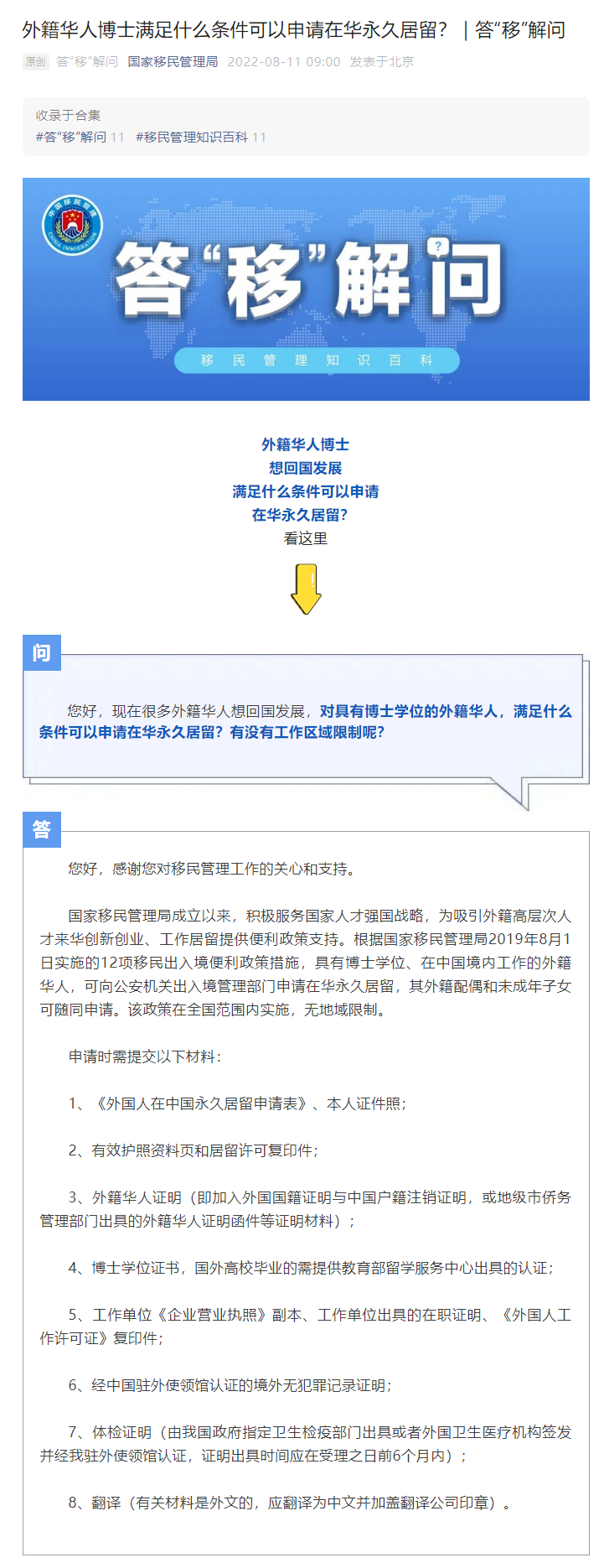 据国家移民管理局微信公众号消息,国家移民管理局成立以来,积极服务国家人才强国战略,为吸引外籍高层次人才来华创新创业、工作居留提供便利政策支持。根据国家移民管理局2019年8月1日实施的12项移民出入境便利政策措施,具有博士学位、在中国境内工作的外籍华人,可向公安机关出入境管理部门申请在华永久居留,其外籍配偶和未成年子女可随同申请。该政策在全国范围内实施,无地域限制。
