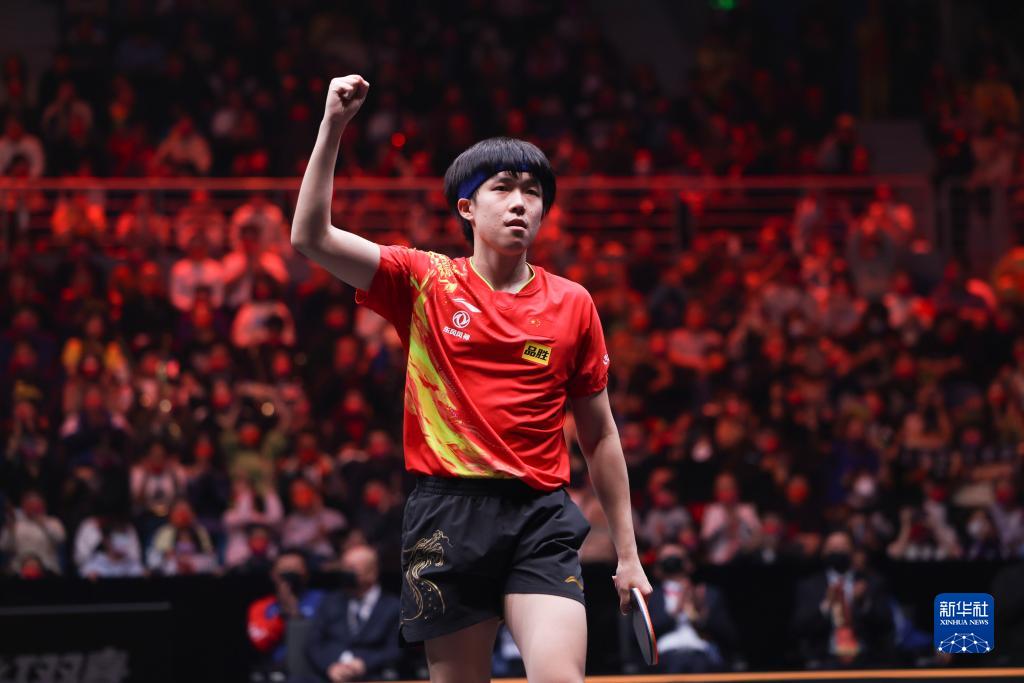 10月30日,王楚钦在比赛中庆祝得分。新华社发(高志勇 摄)
