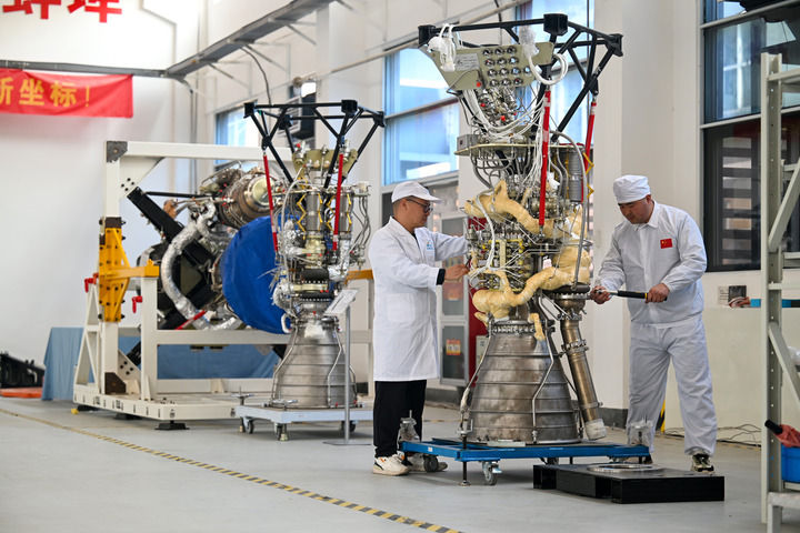 2024年3月11日,在安徽九州云箭航天技术有限公司生产基地,技术人员对即将交付的液体火箭发动机进行最后的检查。新华社发(黄洋洋摄)