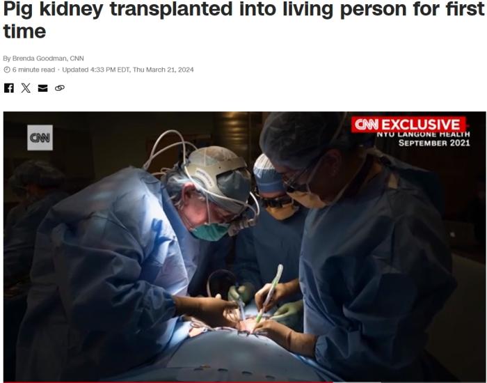 据美国有线电视新闻网(CNN)报道,当地时间21日,美国马萨诸塞州总医院表示,该医院成功操作了世界首例将基因编辑猪的肾脏移植到活体人类受体中的手术。
