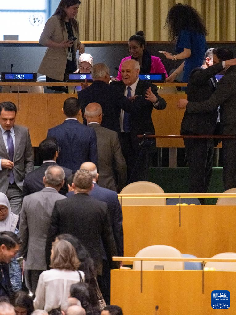 5月10日,第十次联合国大会紧急特别会议以143票赞成、9票反对、25票弃权的表决结果通过决议,认定巴勒斯坦国符合《联合国宪章》规定的联合国会员国资格,应被接纳为联合国会员国。新华社发(联合国供图/曼努埃尔·伊莱亚斯摄)