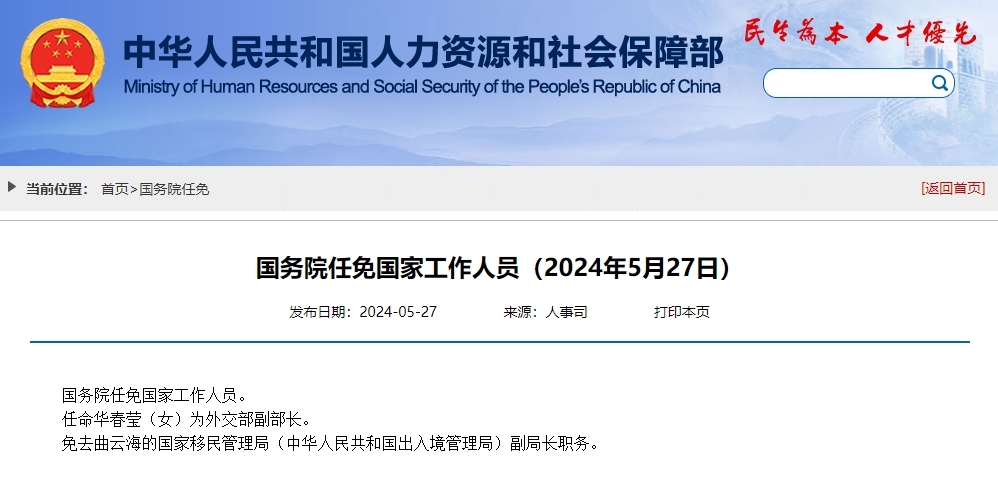 据人社部网站消息,国务院任免国家工作人员。任命华春莹(女)为外交部副部长。免去曲云海的国家移民管理局(中华人民共和国出入境管理局)副局长职务。