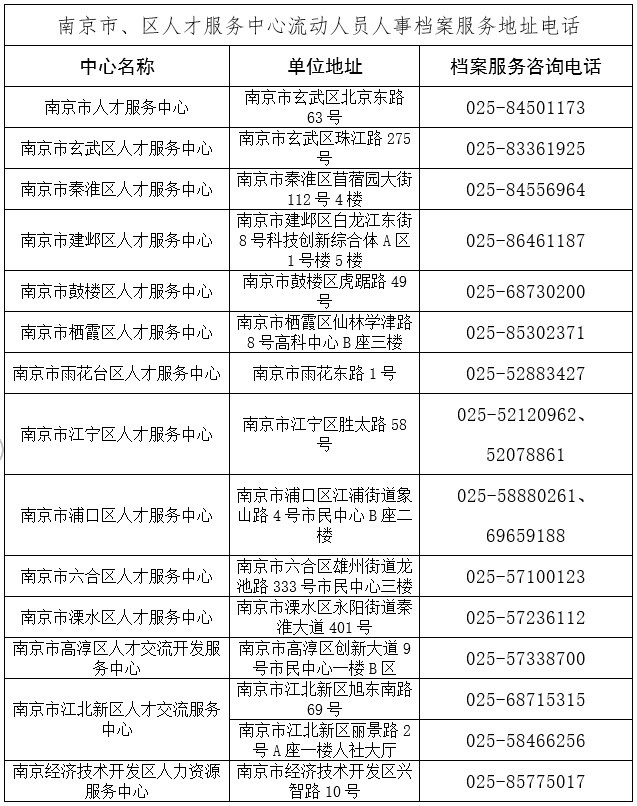 下表为南京市及各区人才服务中心服务地址和电话。档案在这些人才服务机构保管的,可用手机下载“江苏智慧人社”App,搜索“档案查询”功能进行档案查询,也可在线申请开具档案相关证明、办理档案转出等业务。或用电脑登录江苏省人力资源和社会保障厅官网或关注南京市人才服务中心微信公众号,查询档案、办理业务。