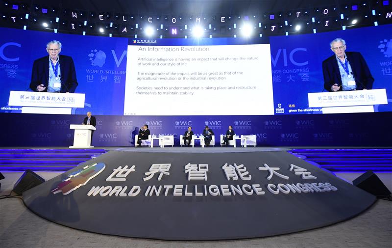 2019年5月16日,图灵奖获得者、中国科学院外籍院士约翰·霍普克罗夫特(左一)在第三届世界智能大会高峰会上发言。 新华社记者 岳月伟 摄