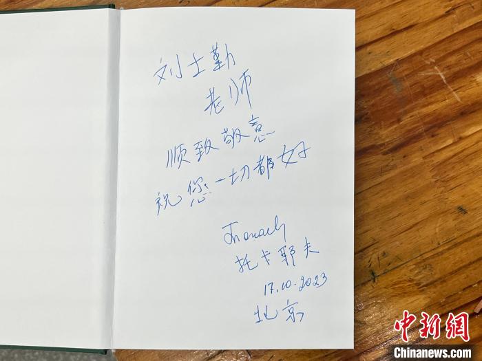 近日,当中新社记者在北京语言大学校史馆内见到该校荣休教授刘士勤时,他手里握着一本墨绿色封皮的书。这是2023年托卡耶夫访问北语时送给刘士勤的礼物,扉页上留有中文题词“刘士勤老师,顺致敬意,祝您一切都好”。