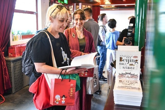 7月5日,北京,海外游客在参观湖广会馆时翻阅北京主题图书。视觉中国供图