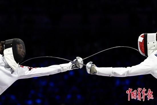 当地时间7月27日,法国巴黎大皇宫,中国香港选手江旻憓(左)在奥运会击剑女子个人重剑金牌赛中,以13∶12的比分战胜法国选手奥丽安·马洛,夺得冠军。中青报·中青网记者 李隽辉/摄