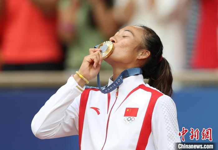 当地时间8月3日,在巴黎奥运会网球女子单打比赛中,中国选手郑钦文以2:0胜克罗地亚选手维基奇,获得金牌。图为郑钦文亲吻金牌。中新社记者富田摄